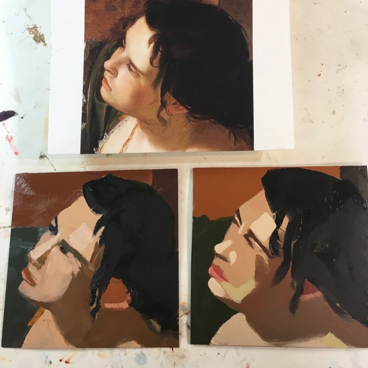 This challenge? Homework complete? My colors are off – done in 40 or fewer strokes with a 1 inch brush. The painting I’m using is Artemisia Gentileschi”s Self-Portrait as the Allegory of Painting, 1638–39, Royal Collection.