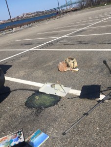First time out to paint this spring, trying out a newish easel at my favorite empty industrial park – yes, it’s 2020. Was close to finished and the wind blew everything over and smeared the painting. Nowhere to go but up! And good news? I can still zip up my painting jeans.