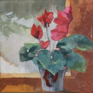 A favorite visual treat in winter, cyclamen are irresistible and a delight to paint. This oil painting is on a 6×6 inch canvas.