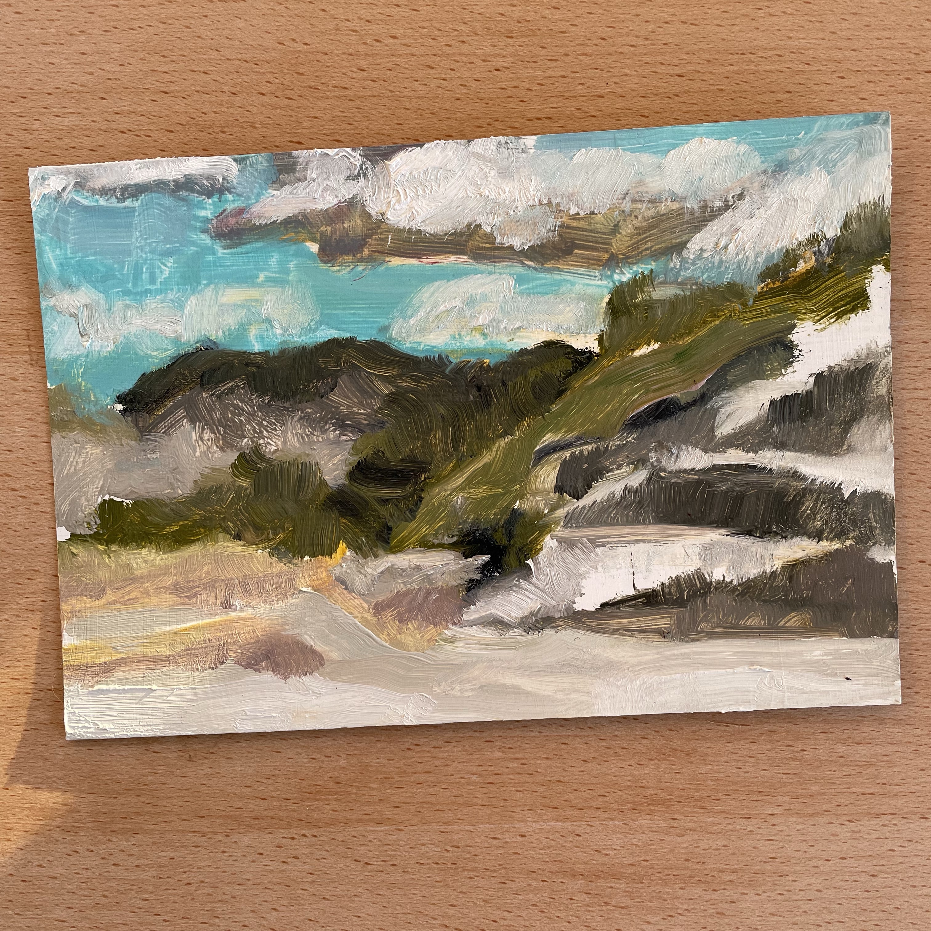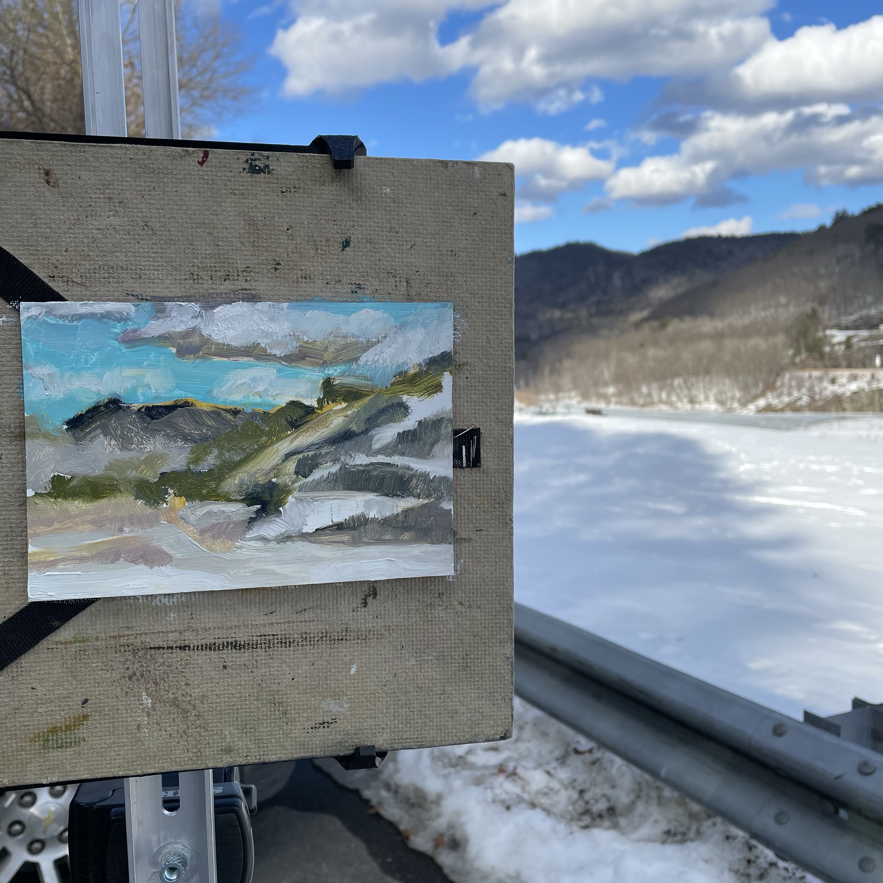 Today was gloriously 50 degrees! a “get some fresh air while painting” kind of day. It was a quick painting session to try out painting on aluminum flashing – yes, the same stuff that’s on your roof. When the 3 coats of acrylic gesso were dry; I got out the door and into the “wild”. I attached the panel to a slim board with Velcro dots. Next time I’ll try double-sided tape. So slick even with 3 coats. This will take some practice.
