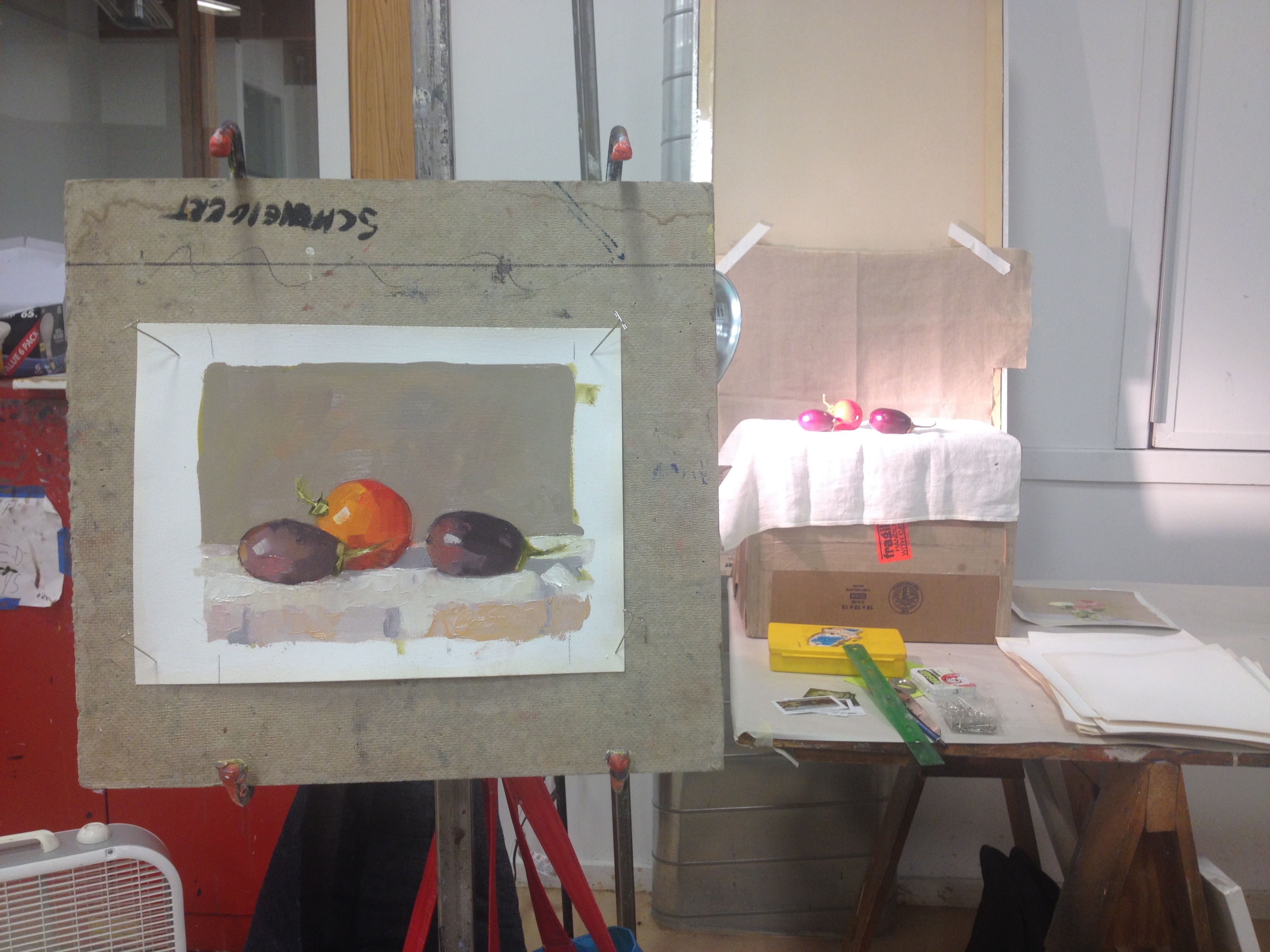 I used the Walnut Alkyd Medium for the imprimatura of the sage and pear painting. It worked. But glossy.